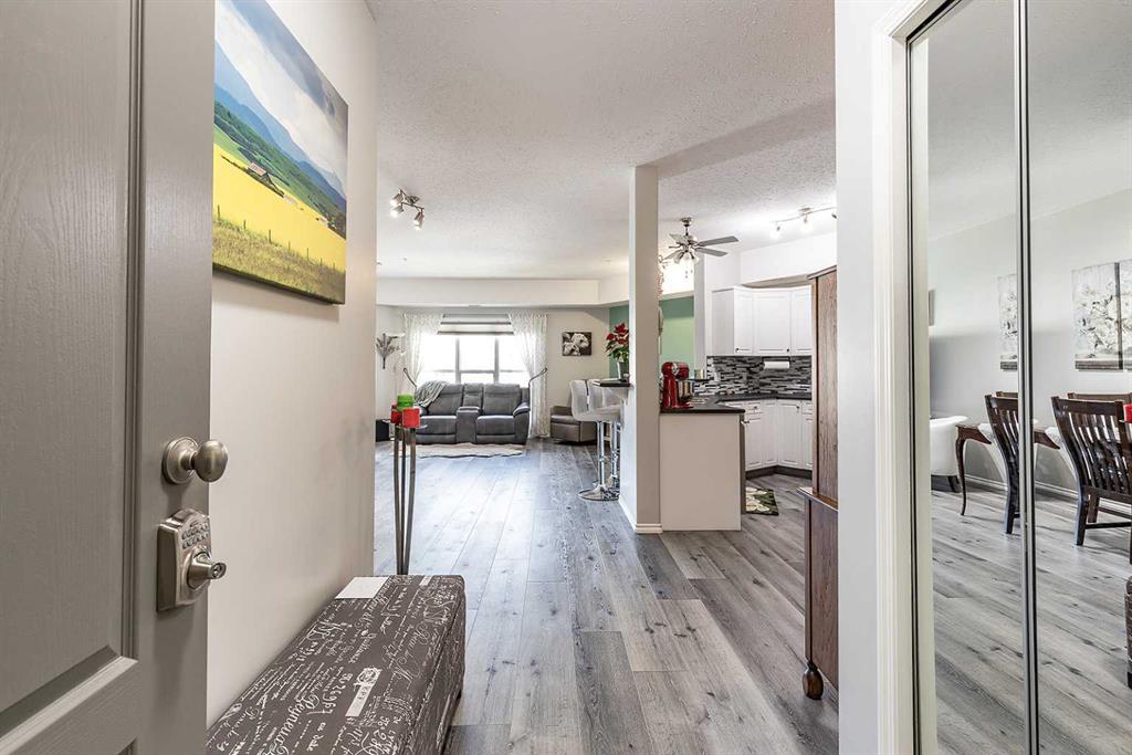 Don’t miss this updated 4th floor unit with beautiful views and featuring TWO titled parking spots. Located in the desired, gated, 55+ community of River Ridge Estates, this beautifully refreshed residence immediately stands apart with its thoughtfully angled layout–designed to feel open and bright. Featuring the Meadow 1 floor plan, there are only 4 units with this floor plan in the entire building. The foyer opens into a spacious central living and dining area. Large windows and an open-concept design create a light-filled, welcoming atmosphere. Just off the living space, a balcony extends the home outward, offering a quiet place to enjoy fresh air and a gorgeous view of the courtyard, greenery, and river. The kitchen features stainless steel appliances, generous counter space, a full pantry, and room for bar-stool seating–perfect for casual meals, conversation, and entertaining. The home includes a large laundry room (with updated washer /dryer), adding storage and everyday practicality. A memory-foam murphy bed is seamlessly incorporated into the 2nd bedroom/office, providing flexible overnight accommodations without sacrificing flow or comfort. The primary bedroom is a serene retreat with a linen closet, a large walk-through closet, and a three-piece ensuite featuring a walk-in shower. This home has been carefully maintained and thoughtfully updated, including new flooring, paint, and backsplash in 2019, new appliances in 2020, and a new heating coil installed in fall 2025–providing long-term comfort and peace of mind. Beyond the suite, River Ridge Estates offers an exceptional lifestyle with amenities reminiscent of a private club: an indoor pool, hot tub, sauna (with aroma-therapy), fitness centre, theatre, library, games room, guest suites, patio with a gas firepit and a beautifully landscaped outdoor courtyard. Everyday conveniences include underground parking with storage, a car wash, workshop, and two parking stalls–one underground and one outdoor with an electrical outlet. This well-established, and scenic community is known for its tranquility, strong sense of community, and beautifully maintained surroundings–offering refined adult living in a highly desirable location. To truly experience the flow, comfort, and lifestyle this home provides, contact your real estate agent to arrange a private showing.